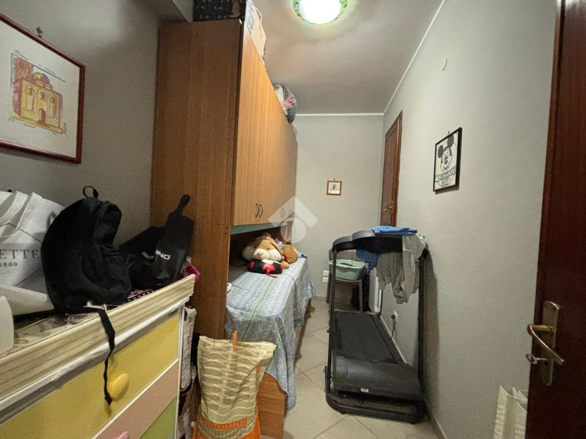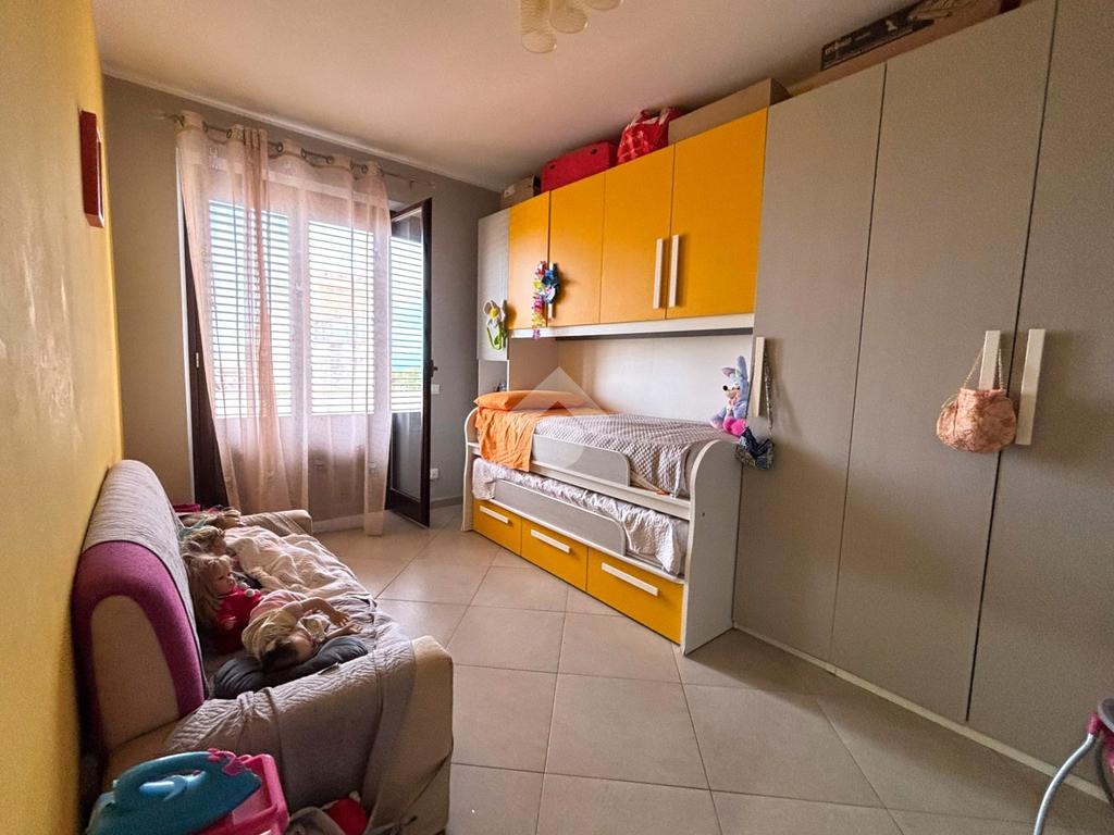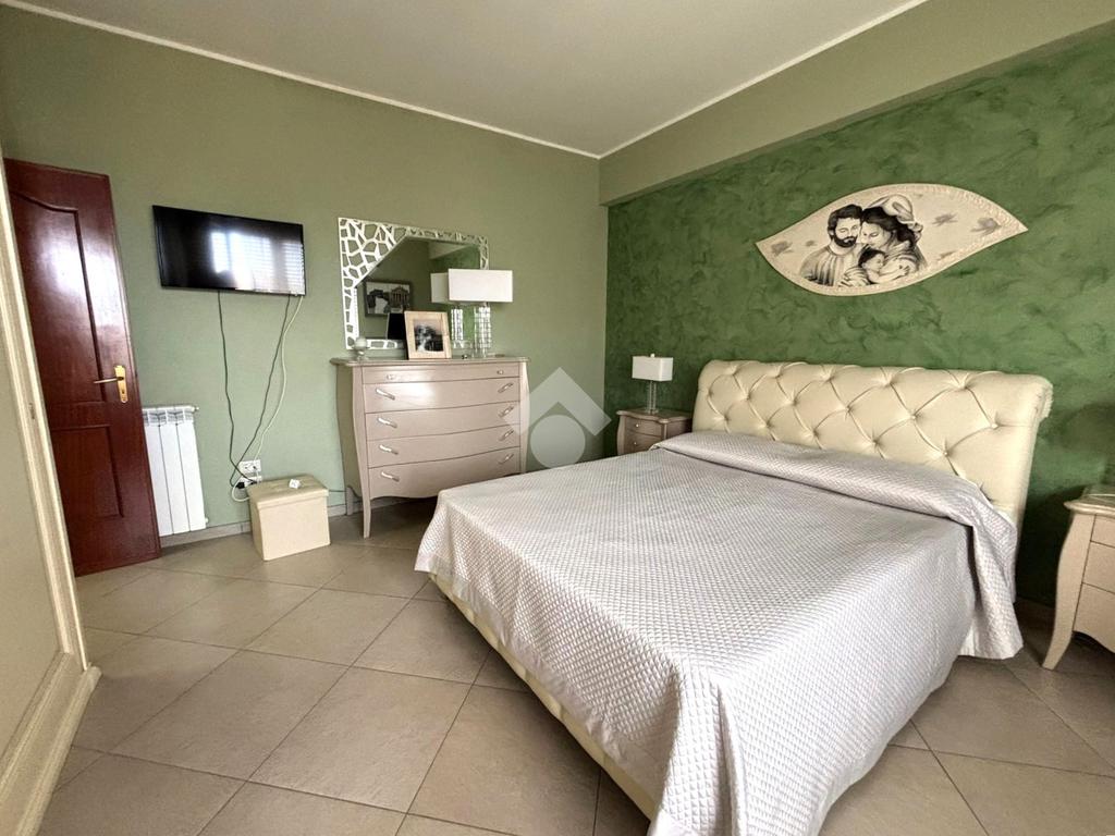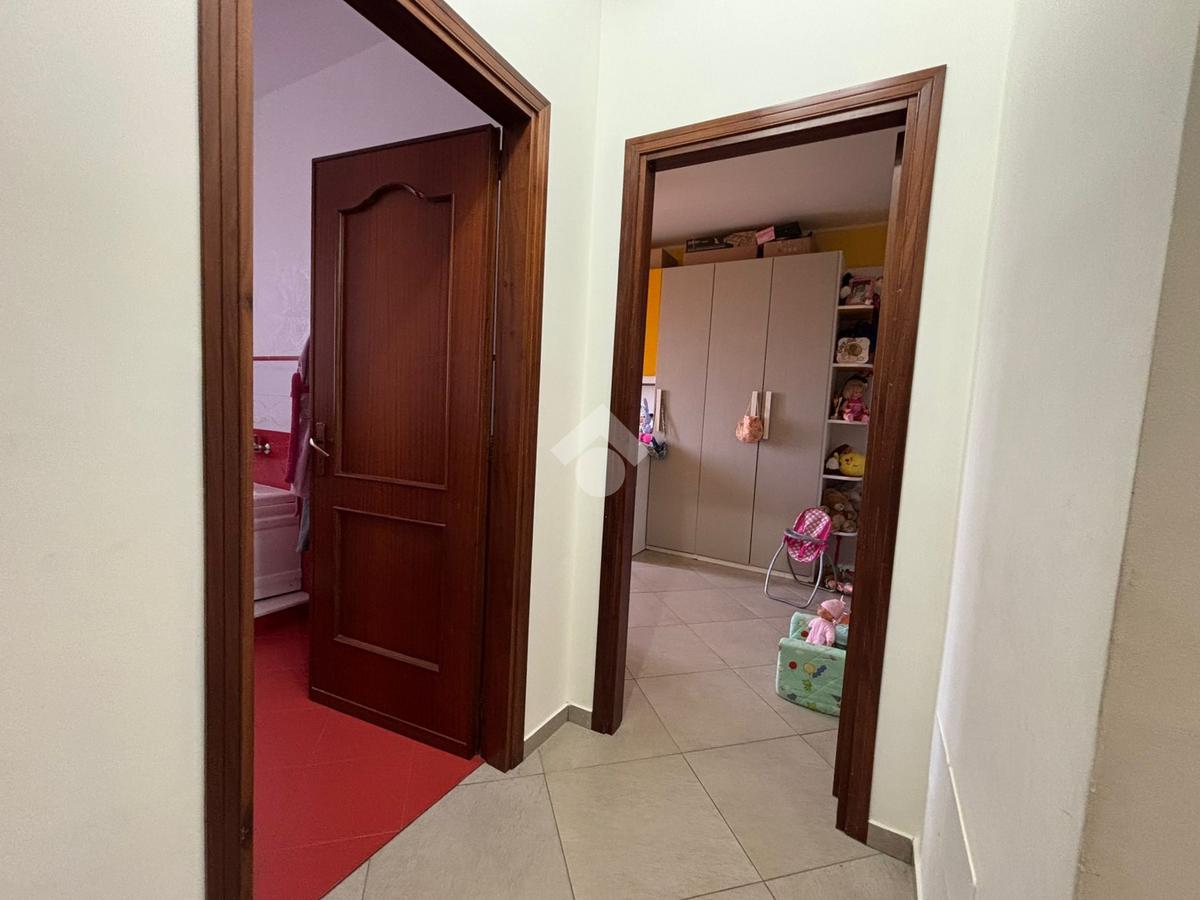 Attraverso un corridoio si accede alla zona notte, composta da una camera matrimoniale e una cameretta, entrambe con apertura sul balcone del prospetto secondario. Completano la soluzione due bagni, uno con vasca e l'altro con box doccia, oltre a due pratici e spaziosi ripostigli.
